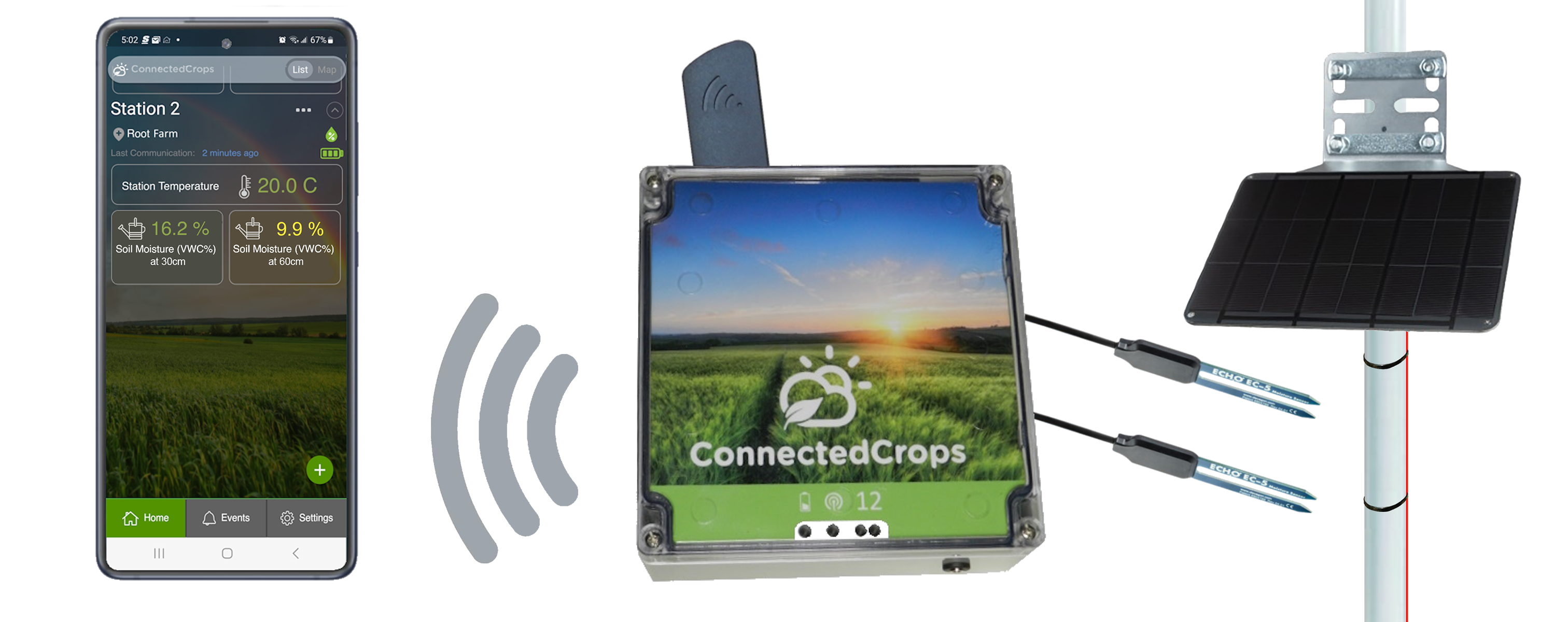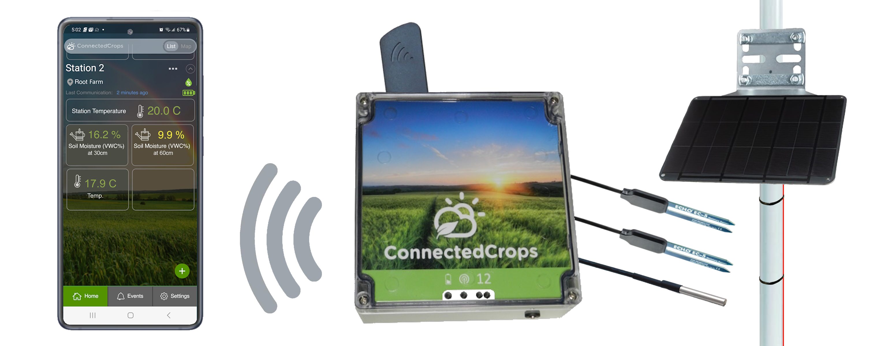 The latest ConnectedCrops Agriculture Station delivers the same real-time soil and air temperature data but now comes with 4 external sensor ports to accommodate more sensor configurations and growth for new sensor types to be released soon. It also now comes with a larger, external solar panel to provide faster battery charging and allow the solar panel to be amounted above the crop canopy to ensure better sun exposure. Recommended by vineyards, fruit and berry growers, the latest station provides farmers with the information they need to make precise irrigation and frost warning decisions, all from their smartphone.